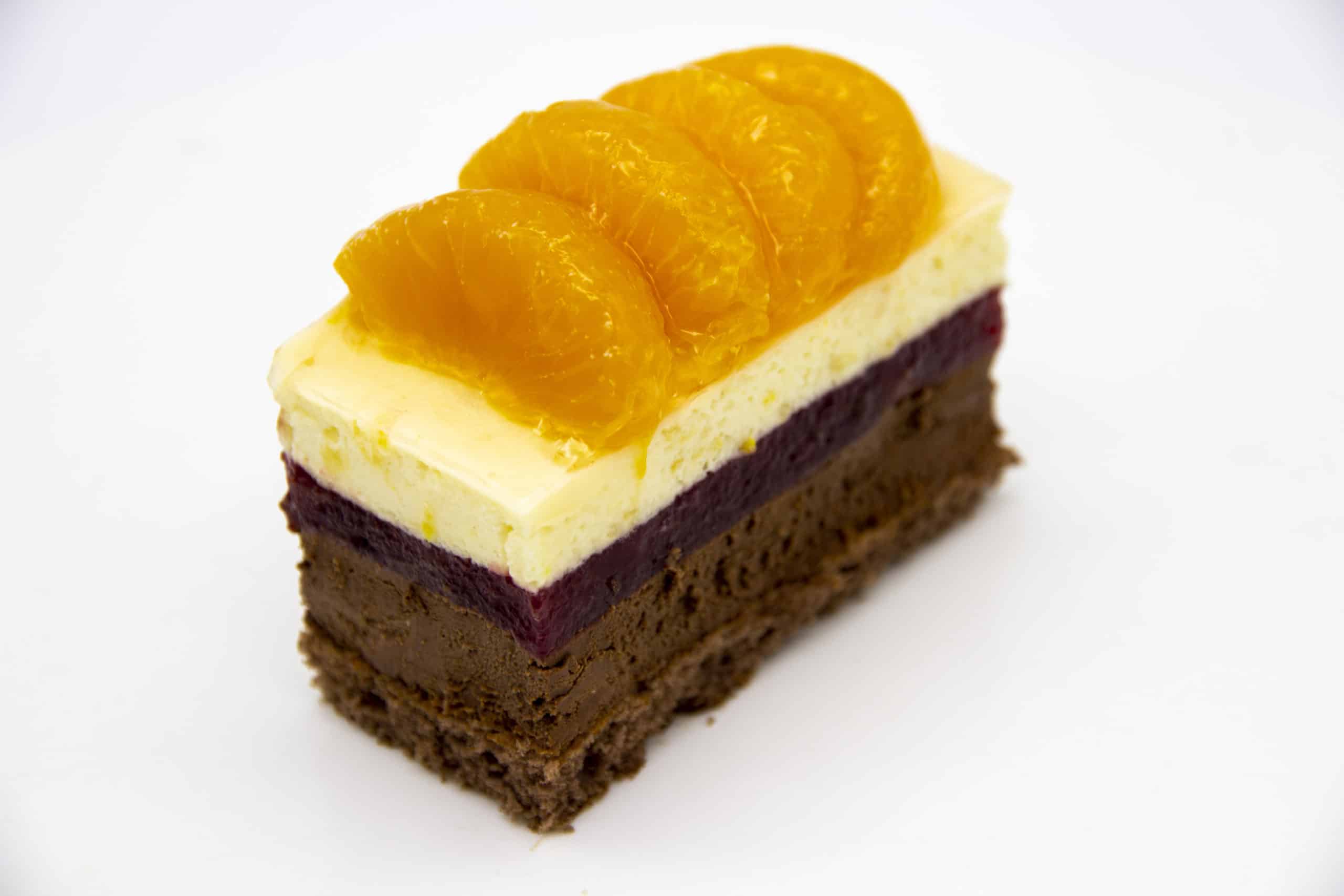 Biskviitpõhjal valmistatud sufleekook, mis sisaldab šokolaadi, pohli, apelsini. Kaunistuseks mandariinid zelees.