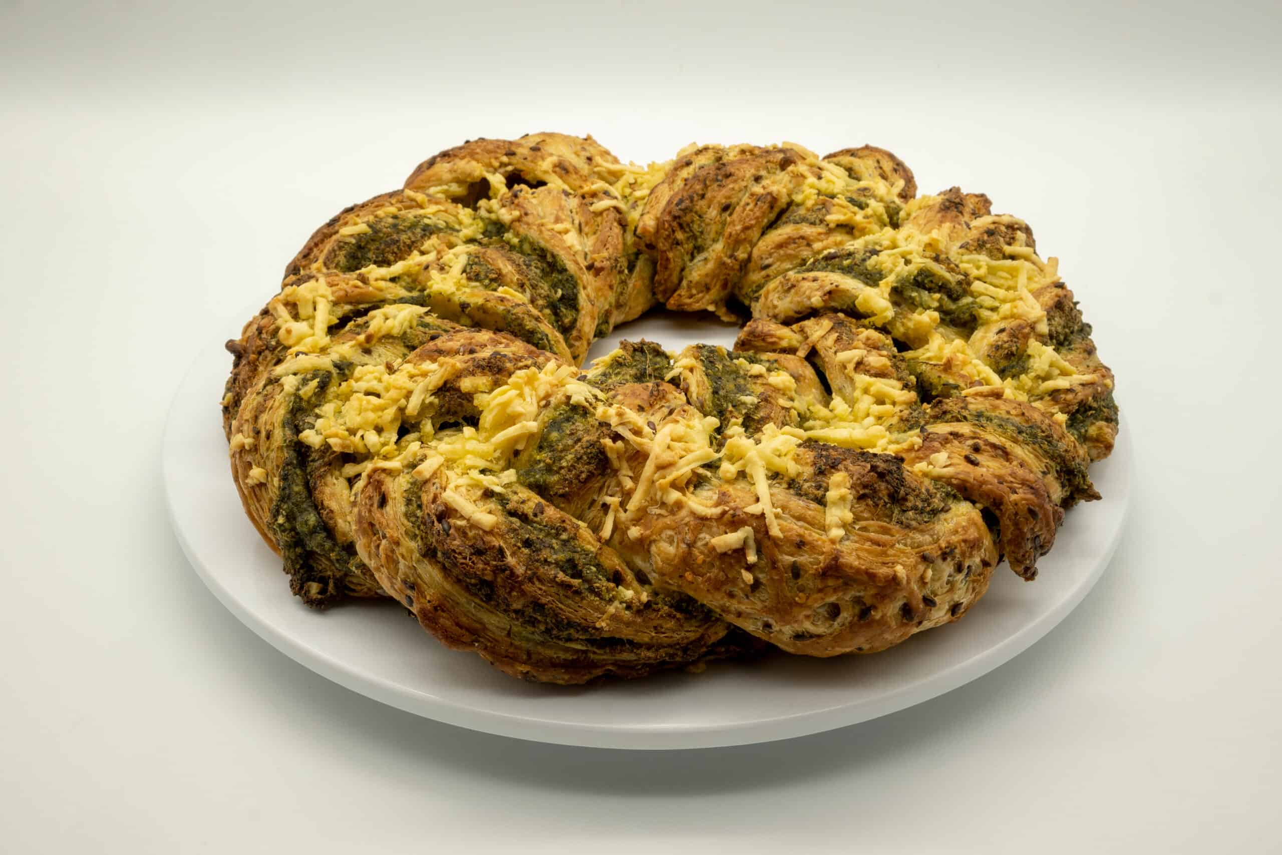 Koostisosad: nisujahu, vesi, seemnesegu (maisihelbed, linaseemned, purustatud soja, päevalilleseemned, hirss, odralinnase jahu, nisugluteen, suhkur, emulgaator E472e, nisulinnased, ensüümid, jahuparandaja E 300), margariin (palmiõli, rapsiõli, emulgaatorid (rasvhapete mono- ja diglütseriidid), päevalille letsitiin,sidrunhape E330), spinat 10%, vegan riivjuust 10% (vesi, modifitseeritud tärklis, kookosrasv, happesuse regulaator (sidrunhape, sool, kaltsiumkarbonaat, naturaalsed maitsetugevdajad, taraseemned, oliiviekstrakt, värvained)), tofu 5% (vesi, sojauba), looduslik beeta-karoteen, B12-vitamiin, presspärm, seesamiseemned, must sool.